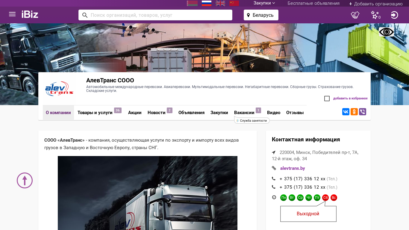 | Название / Заголовок | АлевТранс СООО - Автомобильные международные перевозки. Авиаперевозки. Мультимодальные перевозки. Негабаритные перевозки. Сборные грузы. Страхование грузов. Складские услуги.. 220004, Минск, , Победителей пр-т, 7А, 12-й этаж, оф. 34 |
