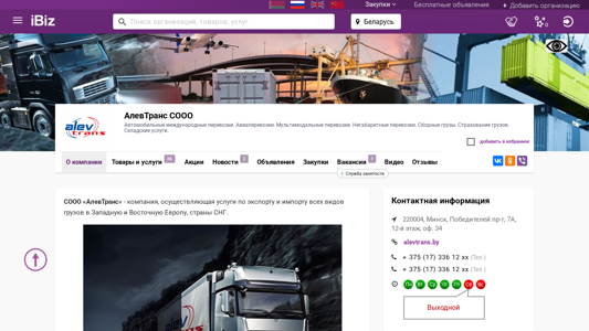 | AI-анализ | lang: ru This website is for AlevTrans SOOO, a logistics company based in Minsk, Belarus. They offer international cargo transportation services, including automobile, aviation, and multimodal methods. They also handle oversized and bulk cargo, as well as storage services and insurance for goods. The company's contact information and address are provided on the website, along with a map for easy access. Their services include transportation of various types of cargo, such as hazardous materials, expensive goods, large items, alcohol, tobacco, and fragile items, as well as maintaining required temperature conditions. They transport goods from various European countries to Belarus, Russia, and countries in Central Asia. Additionally, they offer consolidation, storage, and delivery of consolidated cargo from Europe to Belarus and Russia. The website is in Russian and the domain is alevtrans.ibiz. |