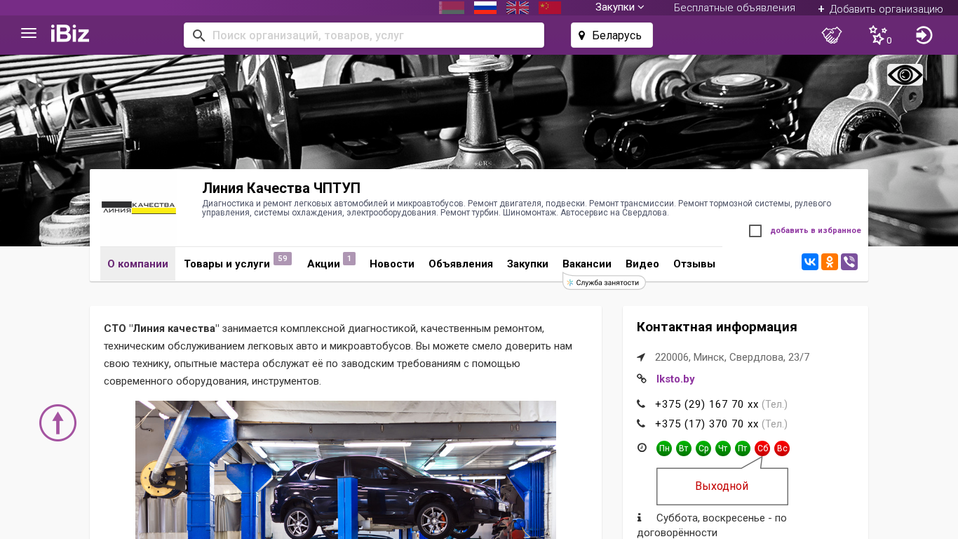 | Название / Заголовок | Линия Качества ЧПТУП - Диагностика и ремонт легковых автомобилей и микроавтобусов. Ремонт двигателя, подвески. Ремонт трансмиссии. Ремонт тормозной системы, рулевого управления, системы охлаждения, электрооборудования. Ремонт турбин. Шиномонтаж. Автосервис на Свердлова. . 220006, Минск, , Свердлова, 23/7 |