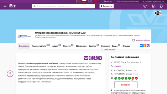 | AI-анализ | --- The website is for the Slutsk Sugar Refinery Plant OAO, which produces white crystal sugar. They offer both chunky and microcrystalline white sugar, molasses, beet pulp, and defective products. The company also deals with fruit and vegetable products. The site includes a map for directions, contact phone numbers, and the address of Slutsk Sugar Refinery Plant OAO. 223610, Slutsk, Minsk region, Govashenko, 6. |