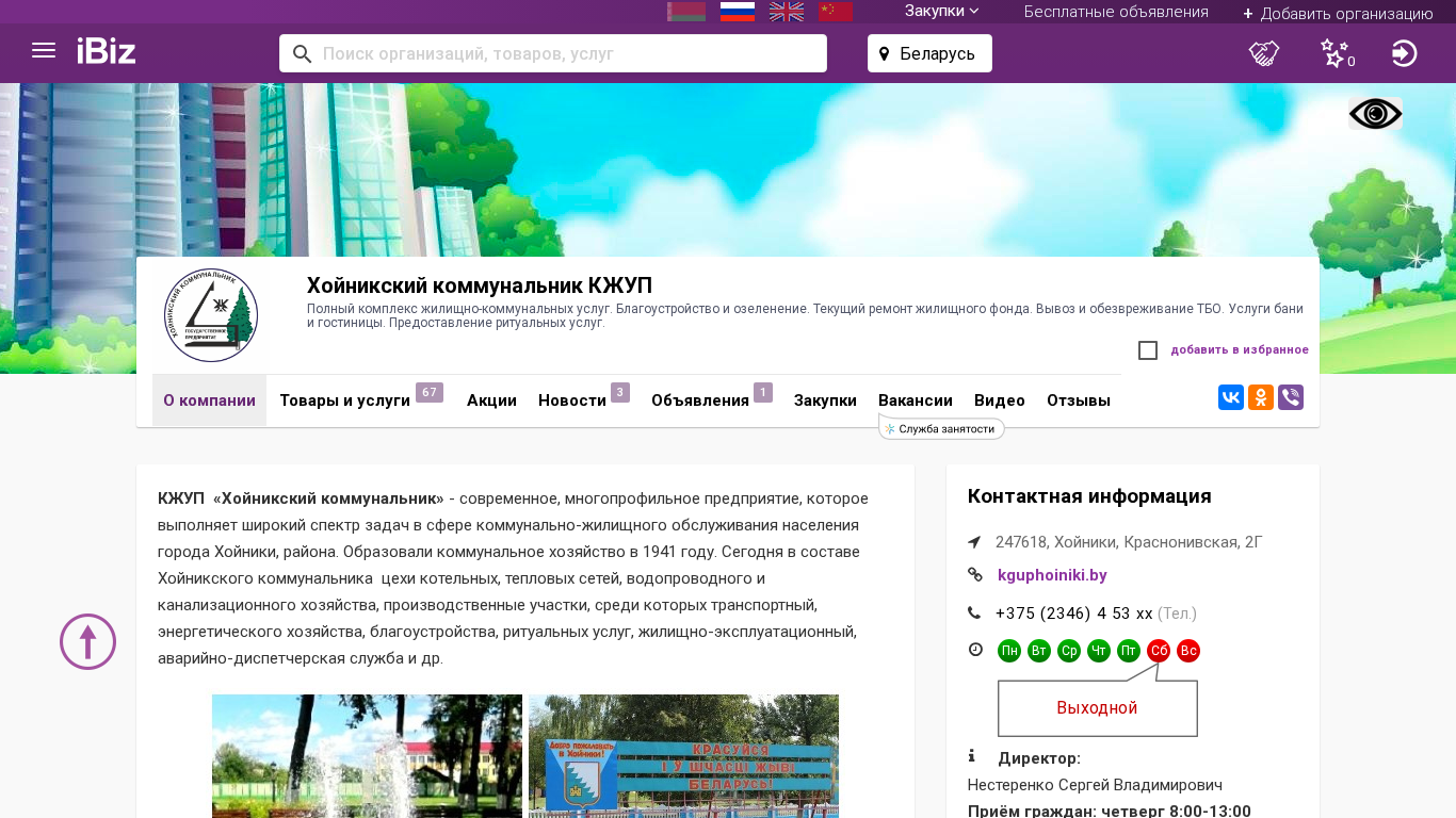 | Название / Заголовок | Хойникский коммунальник КЖУП - Полный комплекс жилищно-коммунальных услуг. Благоустройство и озеленение. Текущий ремонт жилищного фонда. Вывоз и обезвреживание ТБО. Услуги бани и гостиницы. Предоставление ритуальных услуг.. 247618, Хойники, , Краснонивская, 2Г |