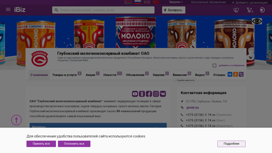 | AI-анализ | The web project "Глубокский молочноконservnyy комбинат ОАО" (Glmkk.ibiz.by) is a leading producer of dairy products in the Republic of Belarus. The company offers various dairy products including milk conserves, butter, powdered milk, hard cheese, and thickened milk. The main production site is located in Gudokoe, Belarus, at Lenina Street 131, and the company also operates filials in Braslav and Checheli. The filial in Braslav, "Браславрыба," specializes in fish processing. The site provides information about the company's products, filials, and contact details including phone numbers and email addresses. The domain is registered with iBiz search, and the company offers various dairy products in large quantities. |