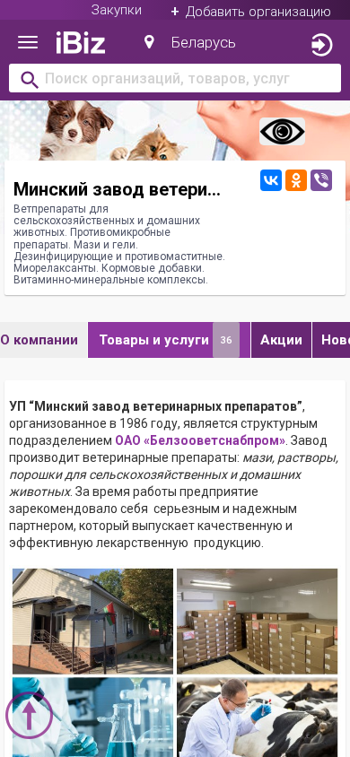 | AI-анализ | The website is for "Минский завод ветеринарных препаратов" (Minsk Veterinary Preparations Plant), a production unit enterprise that specializes in producing veterinary preparations for both agricultural and domestic animals. The website lists various types of veterinary preparations including anti-microbial, mazi and gel, de-worming, myorelaxants, and vitamin-mineral complexes. The address and contact information for the company is also provided. |
