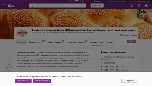 | AI-анализ | This website is for the "Вилейский хлебозавод" branch of the "Борисовский комбинат хлебопродуктов" of the "Минскоблхлебопродукт ОАО" in Belarus. The organization specializes in the production and sales of bread, baked goods, confectionery items, and kvass. The website includes a map for directions, contact phone numbers, and the address: 222410, Вилейка, , Интернациональная, 24, корп. Б. The top keywords are "изделия" (products), "изделий" (products), "квас" (kvass), "услуги" (services), "375" (Belarusian country code), "производство" (production), "хлебо |