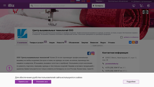 | Название / Заголовок | Центр вышивальных технологий ООО - Высокоскоростная промышленная вышивка на швейных изделиях. Профессиональная вышивка на одежде, на кепках, на ткани, на крое. Изготовление нашивок и шевронов. 3D-вышивка. Вышивка золотыми и серебряными нитями. Нанесение гравировки на сувенирную продукцию.. 220037, Минск, , Авангардная, 61, корп. 3, пом. 28 |