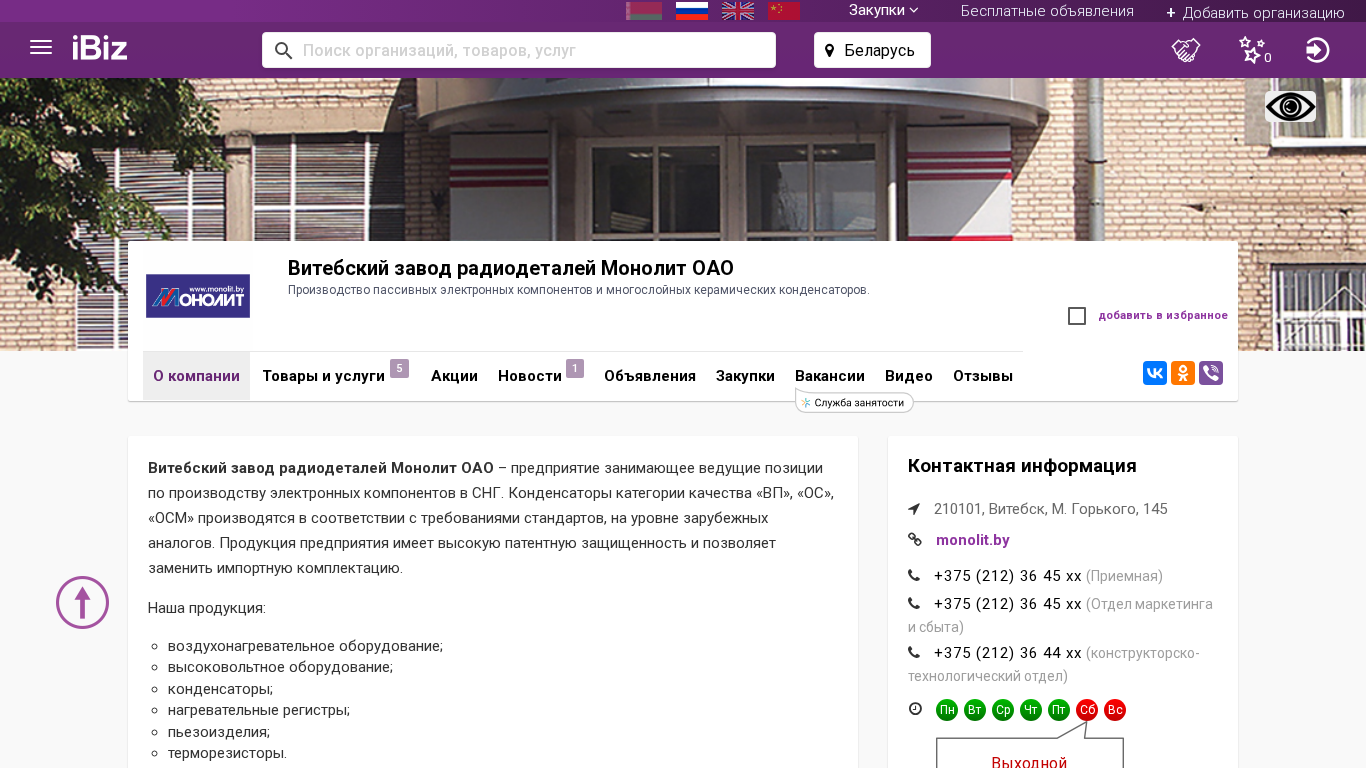 | Название / Заголовок | Витебский завод радиодеталей Монолит ОАО - Производство пассивных электронных компонентов и многослойных керамических конденсаторов.. 210101, Витебск, , М. Горького, 145 |