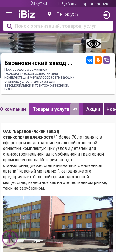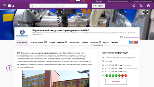 | AI-анализ | --- The website belongs to Baranovichsky Zavod Stanokprinodejlstey OAO (Baranovich Machinery Accessories Plant), a Belarusian enterprise specializing in the production of clamping technology for metalworking machines, machine parts, and components for automotive and tractor industries. The company is located in Baranovichi, Belarus, at Proletarskaya Street 40. The website provides information about the company, its products, and services. Keywords associated with the website include 'metal', 'metalworking', 'machinery', 'industrial equipment', and 'Baranovichsky'. The website does not offer contact details or a map for reaching the company. |