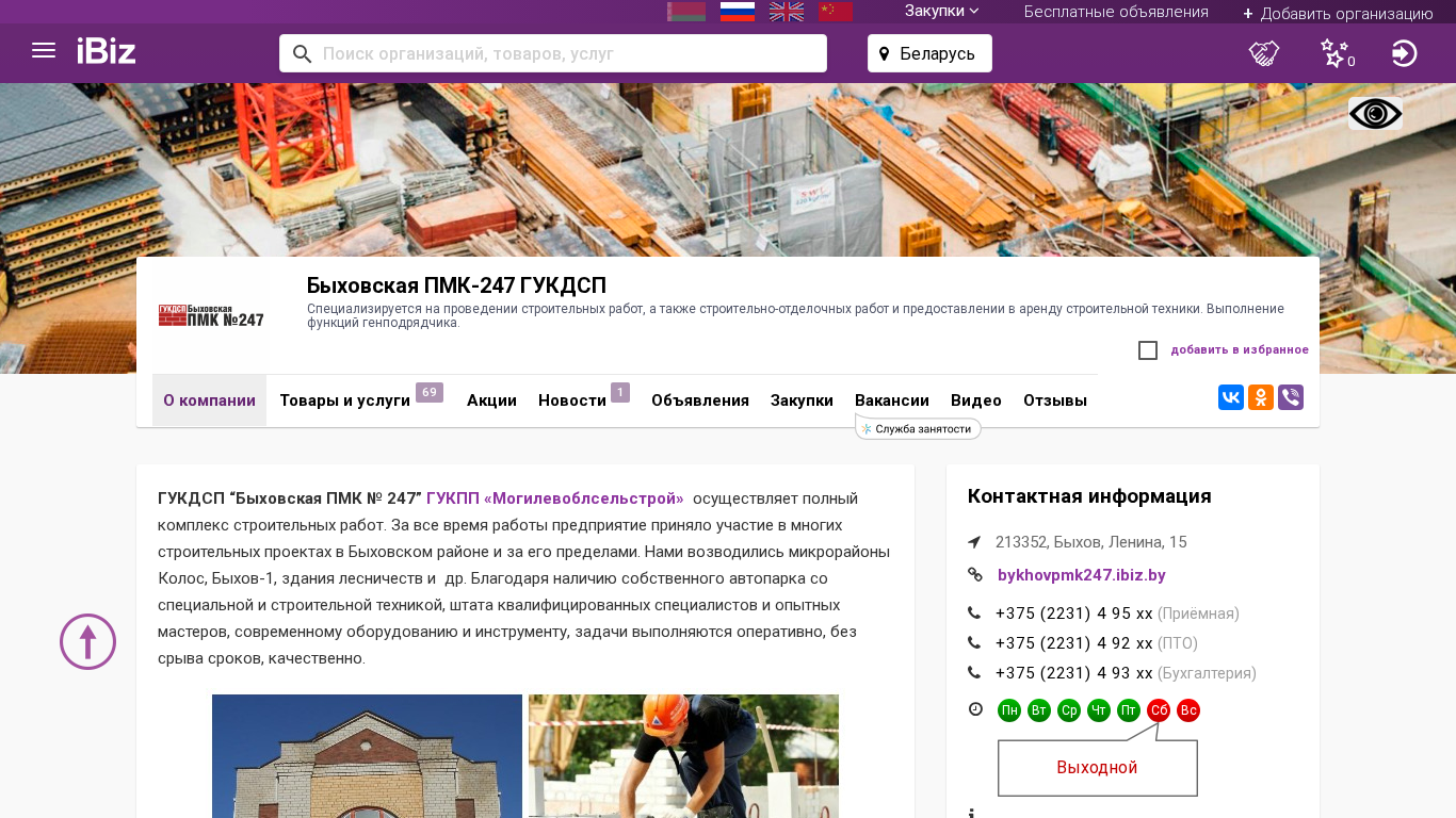 | Название / Заголовок | Быховская ПМК-247 ГУКДСП - Специализируется на проведении строительных работ, а также строительно-отделочных работ и предоставлении в аренду строительной техники. Выполнение функций генподрядчика.. 213352, Быхов, , Ленина, 15 |