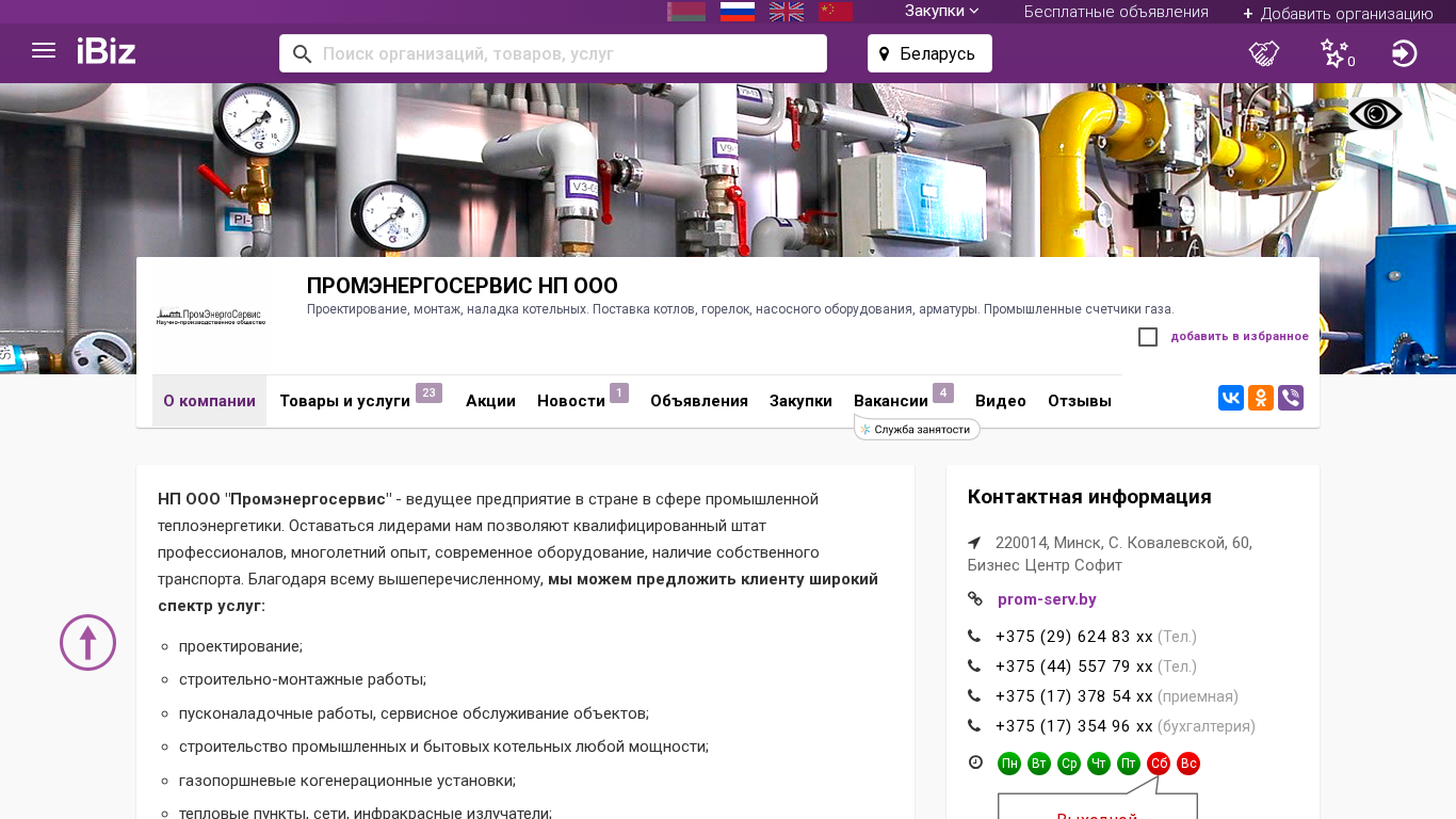 | Название / Заголовок | ПРОМЭНЕРГОСЕРВИС НП ООО - Проектирование, монтаж, наладка котельных. Поставка котлов, горелок, насосного оборудования, арматуры. Промышленные счетчики газа.. 220014, Минск, , С. Ковалевской, 60, Бизнес Центр Софит |