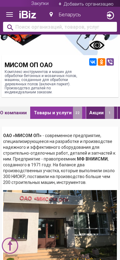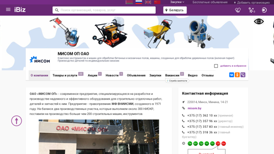 | AI-анализ | The website is a Belarusian company specializing in the production and sale of complex tools and machines for the processing of concrete and mosaic floors, as well as machines designed for the processing of wooden floors (including parquet). Custom production of details according to individual orders. The company's address is 220014, Mininskaya, 14-21, Mininsk, Belarus. The website provides information about the company, its products and services, and includes sections for news, vacancies, and customer reviews. The company is a successor to VNIIISM, founded in 1971, and has two production sites that have completed over 300 R&D projects and supplied more than 200 construction machines and tools. The company manufactures and sells vibratory plates for compacting various road materials, concrete and mortar pumps, |