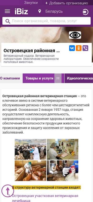 | Название / Заголовок | Островецкая районная ветеринарная станция - Ветеринарный надзор. Ветеринарная лаборатория. Обеспечение сохранности поголовья животных.. 231201, Островец, , Октябрьская, 45 |