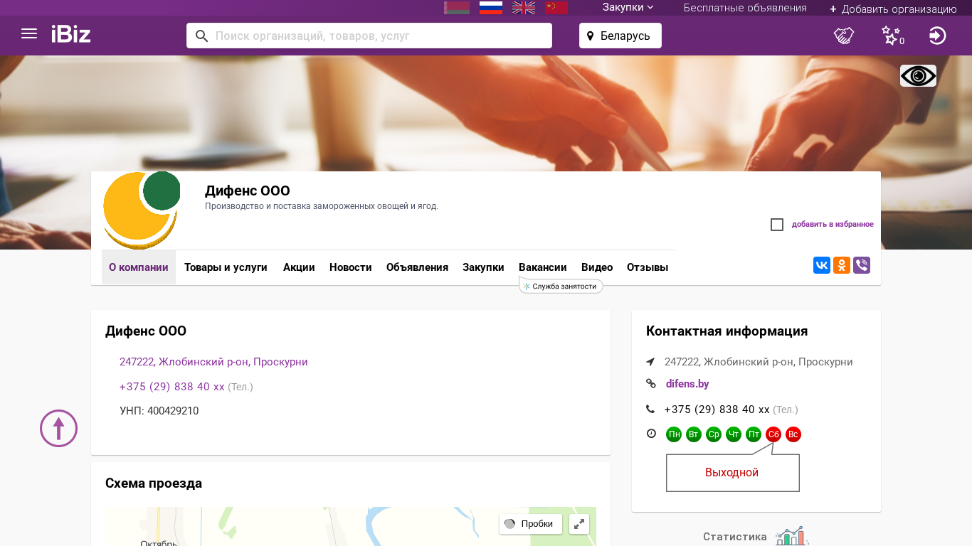 | Название / Заголовок | Дифенс ООО - Производство и поставка замороженных овощей и ягод.. 247222, , Проскурни |