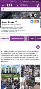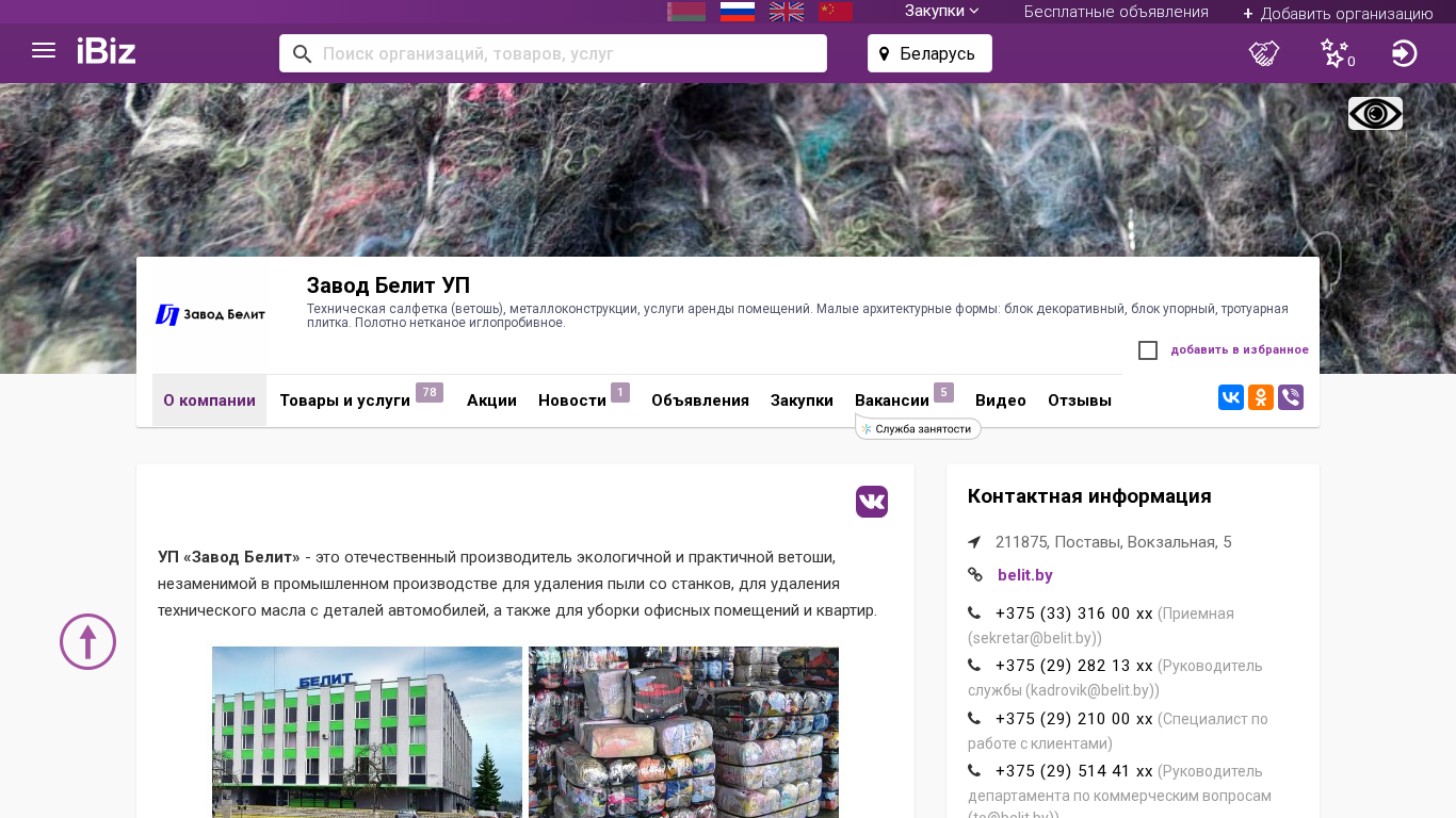 The web project "Belit.ibiz.by" is a Belarusian manufacturing company specializing in technical felt (vetosh'), metal constructions, and rental service of premises. They also produce small architectural forms, including decorative and load-bearing blocks, and non-woven, needle-piercing fabric. The company's address is 211875, Postavy, Vozalnaya Street, 5. The site includes sections for company information, products and services, second-hand materials, metals constructions, building and finishing materials, news, and vacancies.