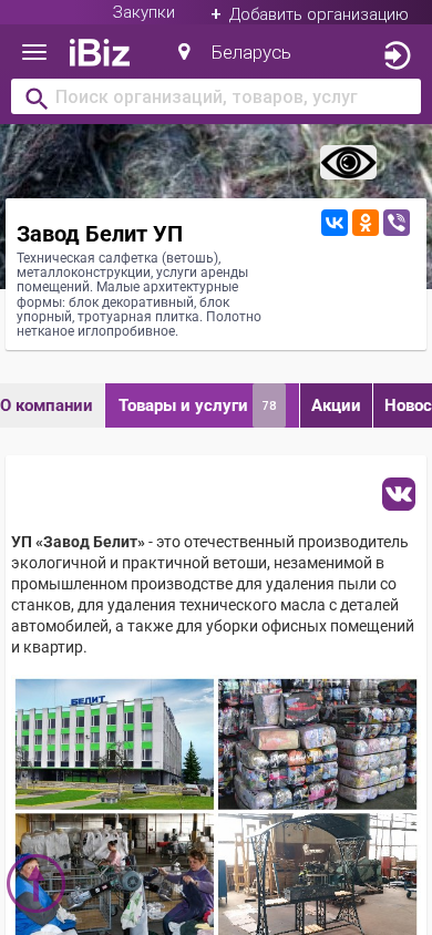 Название / ЗаголовокЗавод Белит УП - Техническая салфетка (ветошь), металлоконструкции, услуги аренды помещений. Малые архитектурные формы: блок декоративный, блок упорный, тротуарная плитка. Полотно нетканое иглопробивное.. 211875, Поставы, , Вокзальная, 5