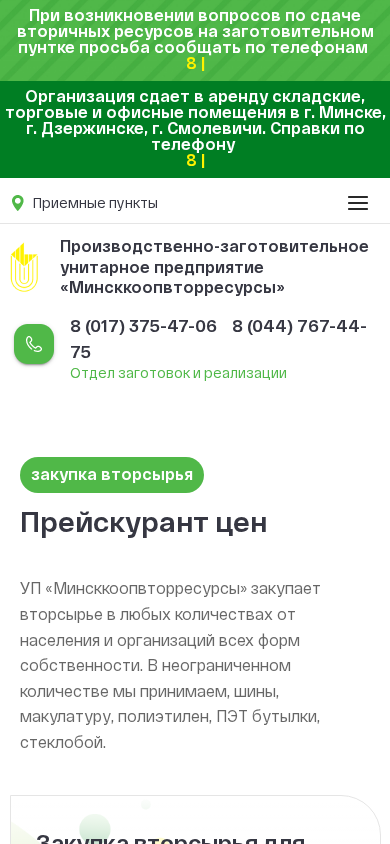 | AI-анализ | --- The web project "Minskcoopvtorresursy.by" is a production and procurement unitary enterprise that buys secondary resources from the population and organizations of the Republic of Belarus. They accept various types of materials, including tires, maculature, polyethylene, PET bottles, and glass waste. The enterprise has offices in Minsk, Dzerzhinsk, and Smolevichi, and offers rental of warehouse, trade, and office spaces. They provide beneficial cooperation terms and can be contacted via phone numbers 8 017 375-47-06 and 8 044 767-44-75 or by email at minskkoopvtorresursy@mail.ru. For inquiries regarding the sale of second-hand resources at collection points, contact the Office of Ac |