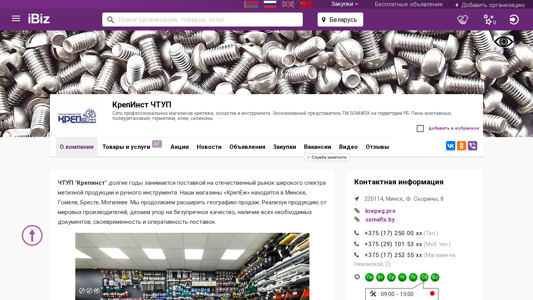 | AI-анализ | The website is a professional network of hardware stores selling fasteners, fittings, and tools. It is the exclusive representative of TM SOMAFIX in Belarus. The product range includes mounting adhesives, polyurethane foams, sealants, adhesives, and silicones. The address and contact numbers of the company KrepInst CHTUP are provided. The website offers free classified ads for purchases. It is based in Minsk, Belarus, at F. Skoryna Street 8. The company has stores in Minsk, Gomel, Brest, and Mogilev and continues to expand its sales geography. The products are supplied from leading manufacturers, with a focus on high quality, availability of necessary documents, timely and operational deliveries. Their client base includes large factories, construction sites, and retail outlets. The products are sold both wholes |