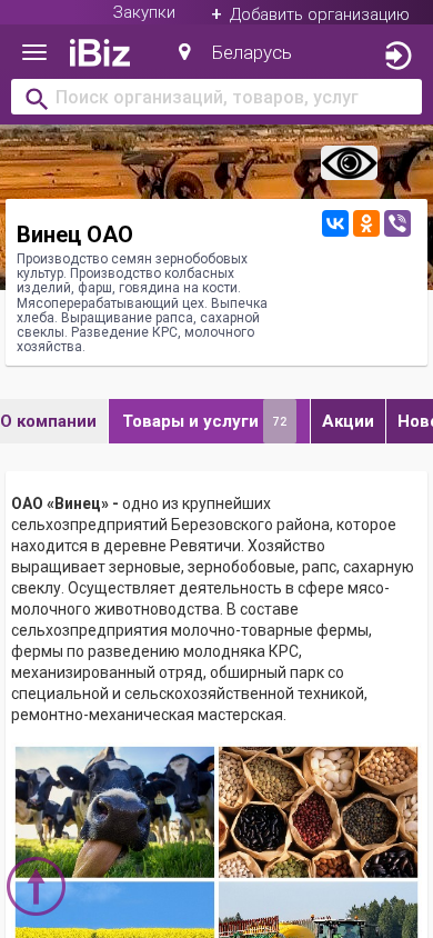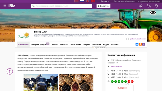 | AI-анализ | The web project "Vinec OAO" is a major agricultural enterprise located in the village of Revyatichy. The business cultivates grains, legumes, rapeseed, sugar beets, and engages in meat and dairy livestock production. The enterprise consists of dairy-cattle farms, cattle breeding farms, a mechanized unit, a large fleet of specialized and agricultural machinery, and a repair workshop. Vinec OAO offers the following products: milk, beef from cattle; live cattle for sale; agricultural produce; and seed grains. All products meet the necessary standards and regulations. The enterprise continues to expand, improving product quality, implementing advanced technologies, increasing sales reach, and regularly updating equipment. The vehicle fleet includes tractors, self-loading cranes, harvesters, and other machinery. Vinec OAO welcomes collaborations. |