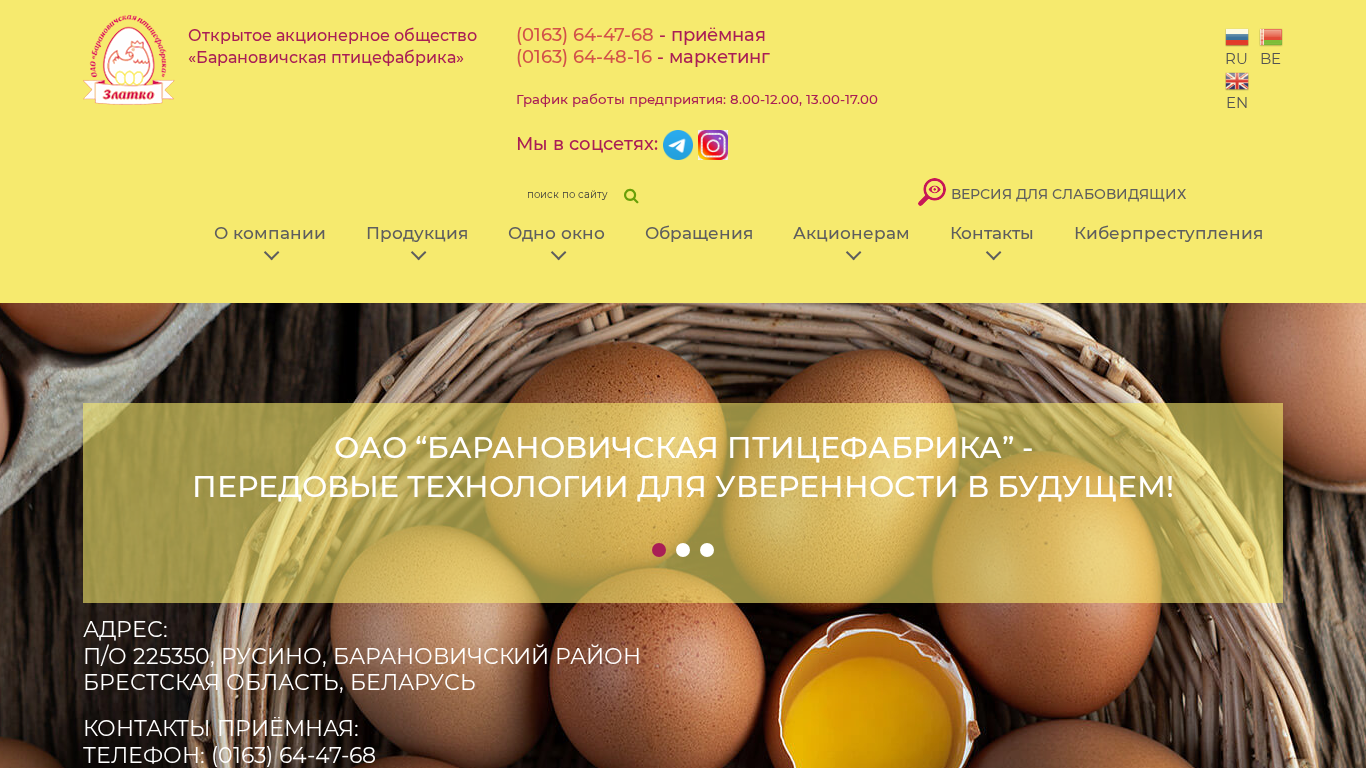 | AI-анализ | This online resource belongs to Open Joint Stock Company "Baranovich Poultry Farm" (0163) 64-47-68 for reception, (0163) 64-48-16 for marketing. The website provides information about the company's production, including chickens and eggs, and features a graphical operating schedule from 8:00 to 12:00 and 13:00 to 17:00. The site is available in multiple languages including Russian and Belarusian, and includes social media links. The design is standard with a size adjustable font and color scheme, and includes images of poultry products. The website also has a version for visually impaired users. |