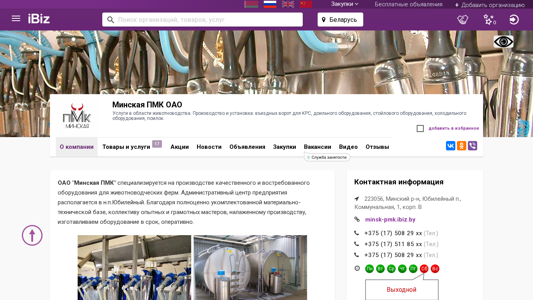 | AI-анализ | The web project "Minskian PMO JSC - Services in Livestock Agriculture. Production and Installation: Livestock Gates, Milking Equipment, Stockyard Equipment, Refrigeration Equipment, Waterers" is a Belarusian company located at 223056, Communal, 1, Corp. V, Jubileiny district, Minsk region. They specialize in manufacturing high-quality and in-demand equipment for livestock farms. Their headquarters houses a fully-equipped material and technical base, a team of experienced and skilled craftsmen, and a streamlined production process. Minskian PMO JSC offers: livestock gates; milking equipment; stockyard equipment; refrigeration equipment for farms; waterers. Their specialists handle repair and maintenance work independently. The company boasts its own transportation fleet, production and repair |