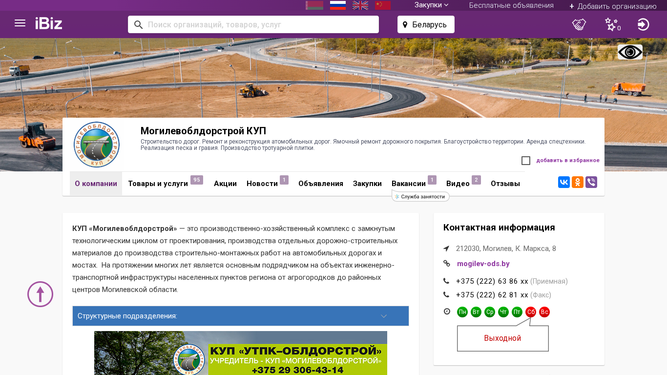 | Название / Заголовок | Могилевоблдорстрой КУП - Строительство дорог. Ремонт и реконструкция атомобильных дорог. Ямочный ремонт дорожного покрытия. Благоустройство территории. Аренда спецтехники. Реализация песка и гравия. Производство тротуарной плитки.. 212030, Могилев, , К. Маркса, 8 |