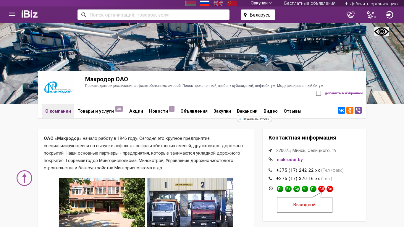 | Название / Заголовок | Макродор ОАО - Производство и реализация асфальтобетонных смесей. Песок прокаленный, щебень кубовидный, нефтебитум. Модифицированный битум.. 220075, Минск, , Селицкого, 19 |