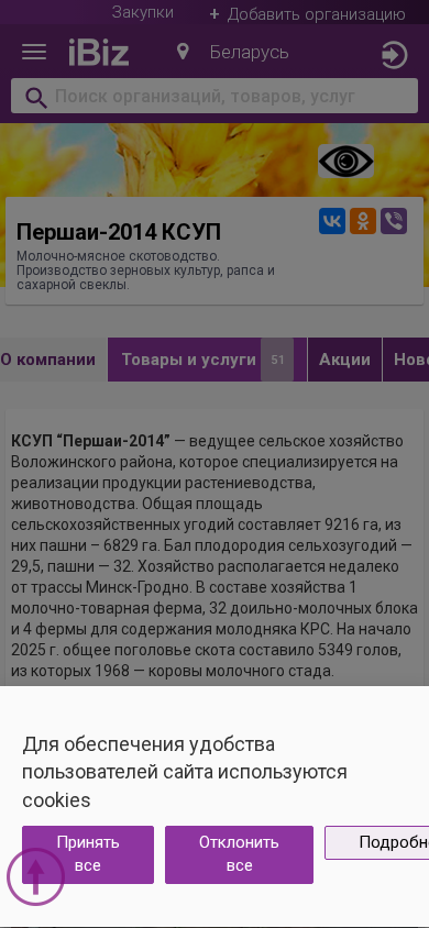 | AI-анализ | language: ru This online resource is dedicated to KSUP (Agricultural Production Cooperative) "PershaI-2014" located in Vоложиnский district, Belarus. The cooperative specializes in the production and sale of agricultural products, including crops and livestock. The total area of agricultural land covers 9,216 hectares, with 6,829 hectares allocated for farming. The farm is situated near the Minsk-Grodno highway and comprises one dairy farm, 32 dairy blocks, and 4 rearing farms for young cattle. As of early 2025, the herd consisted of 5,349 head of livestock, with 1,968 being milk-producing cows. PershaI-2014 produces and sells various crops |