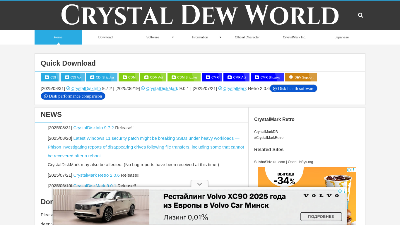 | AI-анализ | The web project Crystal Dew World [en] is a software development and support platform with a focus on disk health and performance comparison tools. It offers various editions of CrystalDiskInfo, CrystalDiskMark, and CrystalMark for download, along with information, profile, and development sections. The site features news articles and announcements, and offers donation and sponsorship opportunities. CrystalDiskMark and CrystalDiskInfo are mentioned in relation to disk performance comparison and software updates. The site also includes a digital signature privacy policy and an official character. The domain crystalmark.info hosts the project. |