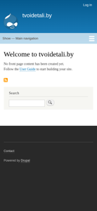 | AI-анализ | This website, tvoidetali.by, is a Drupal-powered platform with a user account system, main navigation menu, footer menu, and search functionality. The title is "Welcome to tvoidetali.by | tvoidetali.by," and the description is blank. The top_words suggest that there is a skip link, a user account menu, and a log in feature. The main navigation menu can be shown or hidden, and there is a footer menu, contact information, and a search function. The home page has not yet been populated with content. |
