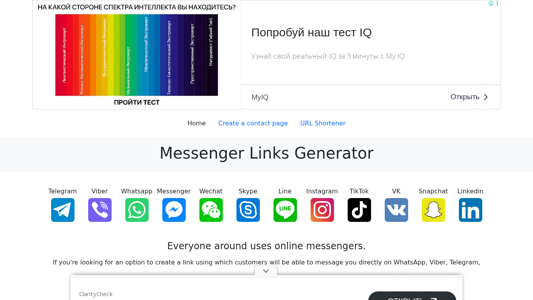 | AI-анализ | --- The website, titled "Messenger Links Generator," provides a service for creating links that enable users to message a contact directly through various messaging platforms such as WhatsApp, Viber, and Telegram. The homepage includes a simple layout with options to create a contact page URL shortener and a list of supported messengers including Telegram, Viber, WhatsApp, Wechat, Skype, Line, Instagram, TikTok, VK, Snapchat, and Linkedin. The website aims to cater to individuals and businesses looking for an easy way to share messenger contact links online. |