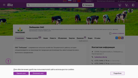 | Название / Заголовок | Любашево ОАО - Сельскохозяйственное предприятие, специализирующееся на мясо-молочном животноводстве, выращивание сельскохозяйственных культур: зерновых, зернобобовых, сахарная свекла, рапс.. 225458, , Любашево д., Пролетарская, 4 |
