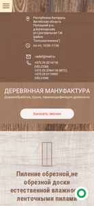 | AI-анализ | language: ru This website is for Company Деревянная Мануфактура in Polotsk, Belarus. The company has been in business since 2011 and was one of the first in Belarus to start producing thermomodified wood. The website provides information about their products including various types of boards, slabs, and planks made from both coniferous and deciduous trees. They offer services for processing customer-supplied wood as well. The company operates Monday to Friday, 10:00-17:00 and their contact information includes email and phone numbers. The website includes sections for their products, customer reviews, and contacts. Keywords associated with the site are 'wood processing', 'drying', and 'thermomodified wood'. |