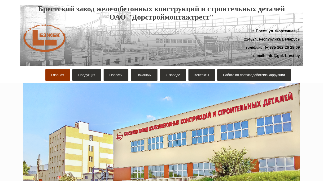 | AI-анализ | The website is the official site of Brestsky Zavod ЖелезоБетонных Конструкций OAO "Dorстроymontazhtrust" located in Brest, Belarus at ul. Fortechna, 1. The site provides information about the company's products, news, vacancies, and contacts. Currently, orders cannot be placed through the site due to a warning from the Ministry of Emergencies of Belarus. The site uses a responsive image gallery and is keyworded with terms related to the concrete manufacturing industry, including 'завод' (factory), 'железобетонных' (reinforced concrete), and 'конструкций' (structures). The site also features a 'Новости' (news) section and a 'Вакансии' (vacancies) section. Other subsidiaries of |