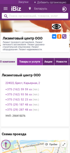 | AI-анализ | This website is a leasing company named Лизинговый центр ООО, located in Брест, Belarus, with the address Карьерная, 2. They offer leasing services for various types of vehicles, including cargo trucks, passenger cars, and road construction machinery, as well as equipment and real estate. The website includes a map for directions, multiple contact phone numbers, and the company's Unified State Registration Number (УНП) 290415076. The operating hours are Monday to Friday from 08:30 to 17:30, with Saturdays and Sundays being closed. |