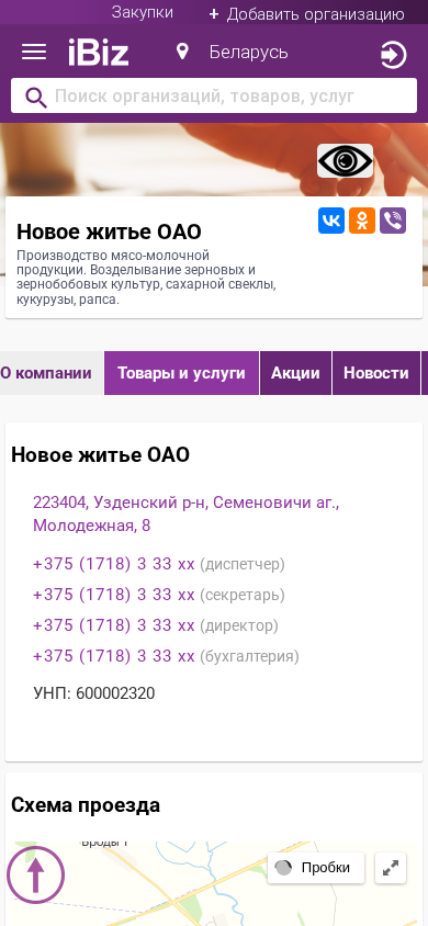 | AI-анализ | This website is for New Life OAO, a Belarusian organization that produces meat and dairy products. The company also engages in farming, growing grains, legumes, sugar beets, corn, and rapeseed. The website includes contact information, including phone numbers for a dispatcher, secretary, director, and accountant. The address of the company is given as 223404, Molojadnaja, Semenovichi ag., Uzden district, Belarus. The company's Unified State Register number is 600002320. The website provides a map and information on how to get there. The company's opening hours are from 8:00 to 17:00, with a lunch break from 12:00 to 13:00, Monday through Saturday. The website is in |