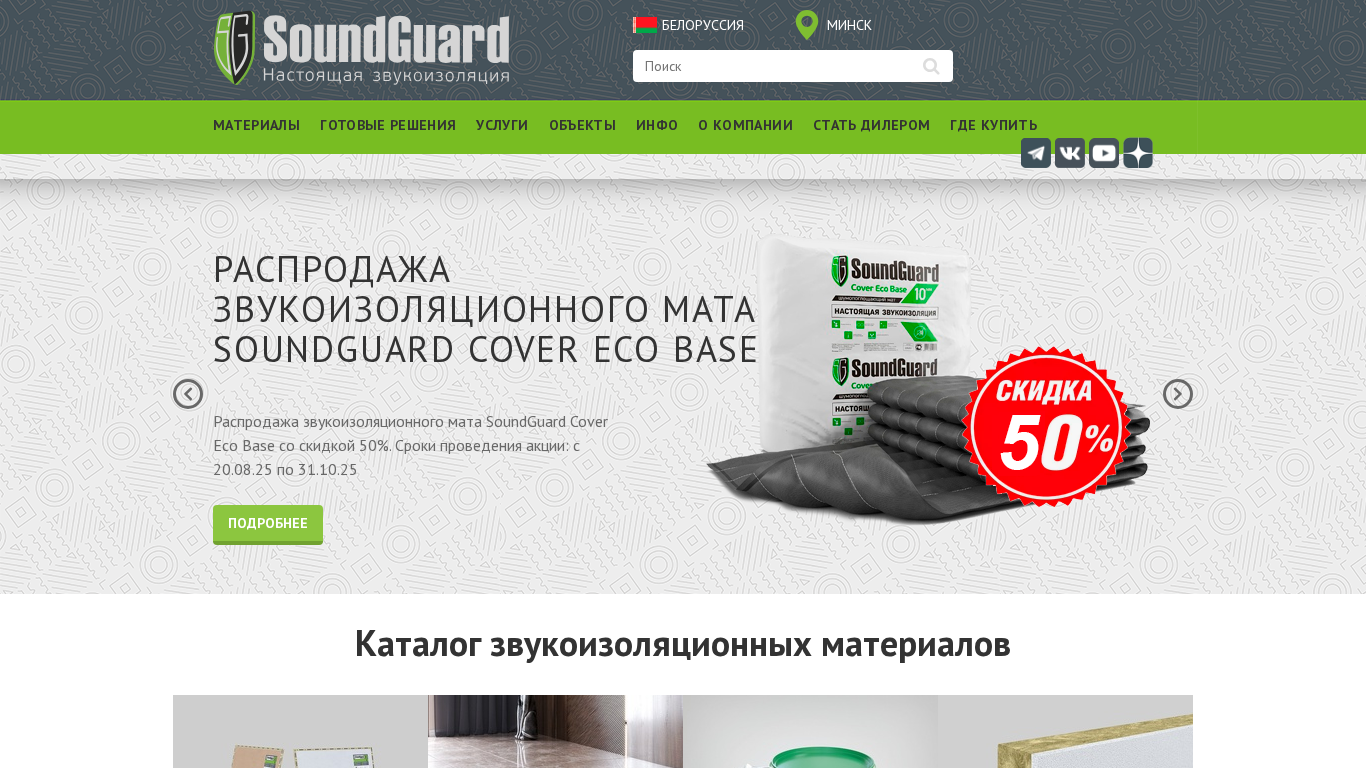 AI-анализ | This website is dedicated to SoundGuard, a Belarusian company specializing in sound insulation materials production. The title of the site translates to 'Real Sound Insulation! SoundGuard Materials Producer'. The description includes keywords related to sound insulation, SoundGuard, and materials for sound insulation. The top_words indicate a focus on materials, panels, plasterboards, systems, and various types of fixings. The site offers a range of products such as membranes, plywood panels, underlayments, soundproofing systems, and gypscore panels, as well as services and consulting. It also features a BIM catalog and special promotions for SoundGuard Cover Eco Base with a 50% discount. The site provides contact information and an invitation to become a dealer. |