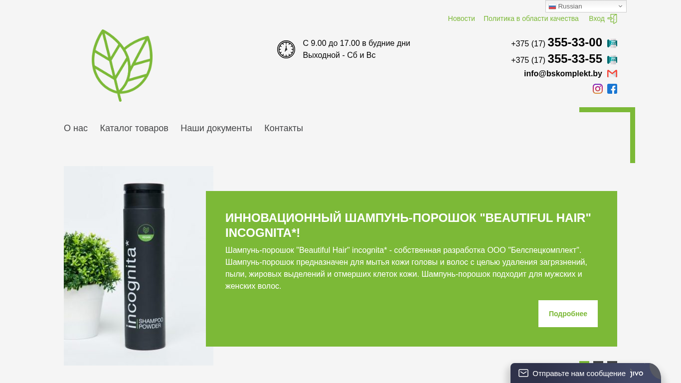 | AI-анализ | This online resource, titled "ООО «Белспецкомплект» - инновационное предпrijatiye" (OJSC "Belspeckompлект" - innovative enterprise), is a Belarusian business website that offers the purchase of innovative products produced in-house at affordable prices. The company specializes in the production of cleaning products, including the "Щит" line of cleaning powders "Щит 1" and "Щит 3," which are safe for use without hand protection and are eco-friendly for humans. Additionally, they produce an innovative hair shampoo-powder called "Beautiful Hair incognita," and a children's diaper rash cream called "Мамина кроха." The site provides information on the company, its catalog of products, contact details, and news on quality policies. The operating hours are from 9 |