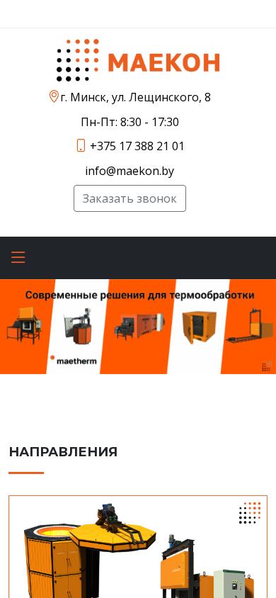 | AI-анализ | --- The website is for МаЕКОН, a company based in Minsk, Belarus, specializing in industrial and thermal equipment. The title of the website is "МАЕКОN | Специальное промышленное и термическое оборудование". The description mentions various types of equipment including furnaces, plates, and services related to thermal equipment and system control. The keywords include 'маекон', 'специальное промышленное и термическое оборудование', 'печи', 'печей', 'направления', 'оборудование', 'термическое оборудование', 'огнеупорные материалы', 'сервис термического оборудования', 'системы управления', 'модернизация и ремонт термического обо |