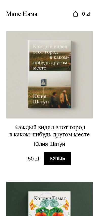 | AI-анализ | The web project "Мяне Няма – Беларускае выдавецтва" (Miane Niama – Belarusian Publishing House) is an e-commerce platform selling various items. The website offers a shopping cart feature, indicating that customers can purchase multiple items at once. The most frequently occurring words in the content are "cup" (to buy), "view" (to look at), "мяне" (mine), "няма" (none), "выбраць" (to choose), "price", and "range". Products include a journal for 2021-2022 for 50 zł, a metal sign for 70 zł, and various items priced between 40 zł and 180 zł. Other items include a shopper with straps, a notebook, a certificate for books, and a book |