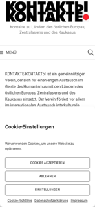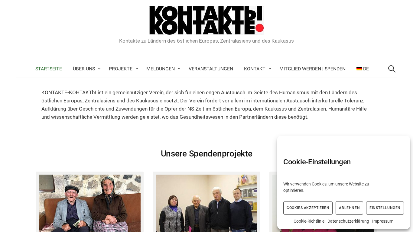| SEO-описание | KONTAKTE-KONTAKTbI - Verein für Kontakte zu Ländern der ehemaligen Sowjetunion ist ein gemeinnütziger Verein für die humanitäre Unterstützung von Menschen in den Ländern der ehemaligen Sowjetunion, für Aufarbeitung der NS-Geschichte und für einen friedlichen kulturellen Austausch. |