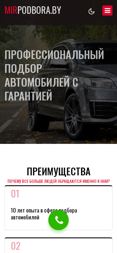 | AI-анализ | The website Mirpodbora.by offers a professional car selection service with a guarantee in Minsk, Belarus. Users can request a car pick-up and benefit from various advantages such as competitive prices, guarantees, and efficient results. Services include a single car check starting from 120 rubles, on-site expert evaluation, and assistance in selecting the best options. The website operates from 9:00 to 23:00, seven days a week, with contact information provided for phone and messaging apps. The company has over 10 years of experience in the car selection industry and operates officially under contract. They save clients time, nerves, and money by working towards achieving the best results and negotiating on their behalf. Services include a full car check with photo and video reports, diagnostics using specialized equipment, and test drives. Additional services, such as comprehensive vehicle inspections at gar |