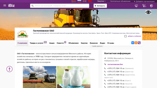 | AI-анализ | The portal is a website for OAO "Gastellovskoe" - a large agricultural production company in Miniski region, Belarus. The company's activities include livestock production for meat and dairy, and crop farming. They cultivate grain crops, sugar beet, potatoes, rapeseed, grasses, and corn. The company offers for sale potatoes for food use, grain (wheat, barley, triticale), livestock (beef cattle in live weight), and seed grain. There are two livestock complexes, "Kanyuchychi" and "Skorinichi," which include a dairy farm and a breeding farm with a closed production cycle. Agriculture is the main source of income, accounting for over 70% of the total product, with milk accounting for 61% and livestock for 14%. The |