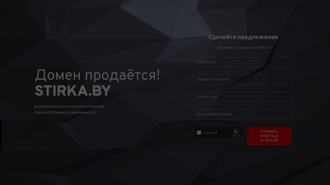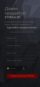 | AI-анализ | The web project STIRKA.BY is an official website. The title of the webpage is "STIRKA.BY, official website" and the description includes the keywords "Official website STIRKA.BY". The top words on the page are "stirka" (occurring 4 times), "домен" (domain), "прода" (sell), "ться" (be), "возможна" (possible), "рассрочка" (installment plan), "платежа" (payment), "месяцев" (months), "аренда" (rent), "месяц" (month), "правом" (right), "выкупа" (purchase), "сделайте" (make), "предложение" (offer), "сообщение" (message), "в |