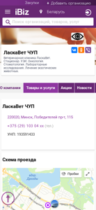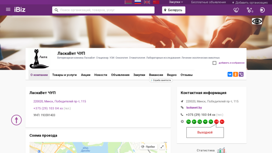 | AI-анализ | This website is for the veterinary clinic "ЛаскаВет ЧУП" located at 220020, Минск, Победителей пр-т, 115. The clinic offers various veterinary services including ultrasound (УЗИ), oncology, stomatology, laboratory research, and treatment for exotic animals. Contact information and a map for directions are provided. The company's Unified State Register number is 193591433. The website includes sections for company information, products and services, news, job vacancies, and customer reviews. Clinic hours are from 9:00 AM to 6:00 PM, Monday through Friday, with weekends being closed. Services are available without breaks for lunch. |