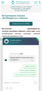 | AI-анализ | This online resource is the website of a veterinary clinic named "ВетМедЦентр" located in Minsk, Belarus. The clinic is situated on Voostochnaia Street 115 and offers a full range of services of a modern veterinary clinic. Experienced veterinarians, compassionate vet nurses, and professional veterinary doctors are available. The website provides information on services like consultation, pricing, ornithology, chip implantation, vaccination, rat care, sterilization, stomatology, dermatology, ophthalmology, ultrasound (UZI), X-ray (rentgen), cardiology, therapy, surgery, laboratory, trauma care, and gynecology. The clinic also offers services for treating pets with titles for rabies. The contacts provided are for Voostochnaia Street 115 and |