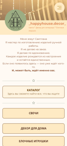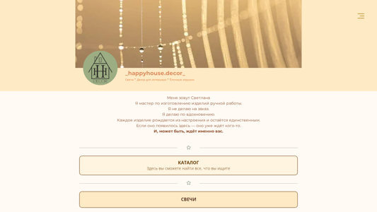 | AI-анализ | The portal happyhousedecor.by offers unique handmade candles and decor for a cozy and warm home atmosphere. The main page displays all handcrafted items, including candles for interior decoration, wooden Christmas ornaments, and contacts for purchases. The creator, Svetlana, does not take custom orders but produces items based on inspiration. Each piece is unique and waiting for its owner. The catalog includes candles, decor for the home, and Christmas ornaments for purchase. Svetlana's contact information and a shopping cart are also provided. The UNP number for tax payments is AV9447734. |