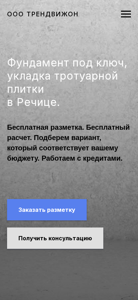 | AI-анализ | --- This online resource is dedicated to foundation construction and paving services in Rechitsa, Belarus. OOO Trendvision offers foundation installation and trowel paving with a 100% quality guarantee. With over 15 years of experience, they employ professionals with a decade of tenure. Their flexible payment system and discount system are noted. The company adheres to deadlines. Contact information includes +375291550808 and +375291661312. The website provides information on foundation construction under the key, including the process of marking, digging the trench or pit, installing formwork, arming, and pouring concrete. For paving services, the company guarantees the installation of paving stones for pedestrian areas. The installation process includes marking, planning the territory, preparing the foundation, |
