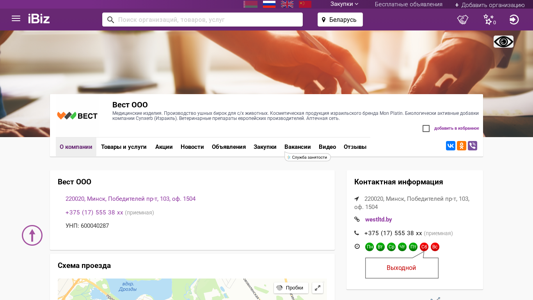 | AI-анализ | The portal West OOO is a medical supplies company specializing in the production of ear plugs for farm animals. It offers cosmetic products from the Israeli brand Mon Platin, as well as biologically active additives from the Israeli company Cynxerb. The website also sells veterinary medicines from European producers and operates an apothecary chain. The site includes sections for purchases, newsworthy items, job listings, and videos. Contact information and a map for reaching the office are provided. The company's UNP number is 600040287. The office is located in Minsk at Победителей пр-т, 103, оф. 1504 and can be reached at +375 (17) 555 38 xx during business hours, Monday through Friday, 9:00 AM |