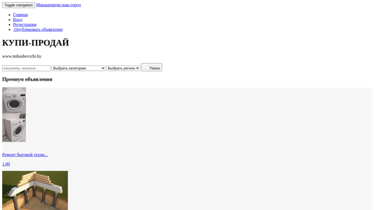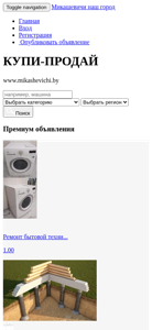 | AI-анализ | This online resource, titled "Микашевичи наш город" (Our City Mikashevichi), is a local classifieds website with a focus on various services and goods for sale in the city of Mikashevichi, Belarus. The website offers categories for repair services of household appliances and electronics, telephony and communication, television and video, audio technology, gadgets, automobiles, real estate, construction services, beauty and health, clothing, and social networking for finding jobs or companionship. The top keywords include 'show', 'all', 'repair', 'dollar', 'household', 'services', 'clothing', and 'Mikashevichi'. The website features a search function, premium listings, and a registration system for users to publish their own ads. The main page displays various categories, with the option to filter by region. The last few |