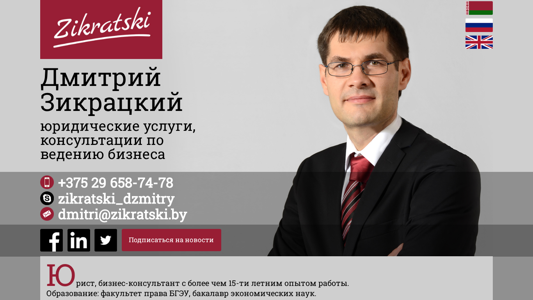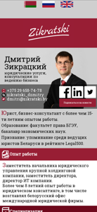 | AI-анализ | The web project "Дмитрий Зикрацкий юридические услуги" (Dmitry Zikratsky Legal Services) is a website offering legal services. The title and description of the site indicate that the main focus is on legal consulting for businesses. The domain belongs to Dmitry Zikratsky, a business consultant with over 15 years of experience and a law degree from BSU. He is recognized as one of the leading lawyers in Belarus, according to the Legal500 rating. The site includes information about Dmitry's professional background, with experience as the head of a legal department in a large holding company, a deputy director, and the director of an IT company. He has over 8 years of experience in legal consulting, including leading the Belarus office of an international law firm. The website's services include comprehensive legal consulting, optimization of business processes |