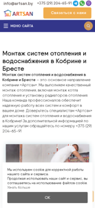| AI-анализ | --- The portal Artsan is a Belarusian company offering design and installation services for heating systems in Cobrin and Brest, as well as the surrounding area. The company boasts low prices, turnkey solutions, and a quality guarantee. With over 10 years of experience, Artsan can be reached at +375-29-204-65-91. The website provides information on various heating services, including water floor heating, sewage installation, radiator mounting, and sanitary fixture replacement, among others. The company also offers installation of electric and gas heating systems, boilers, and internal water supply systems. The site includes a section for customer testimonials, pricing, and news. The primary focus of Artsan is the installation of heating and water supply systems in Cobrin and Brest. |